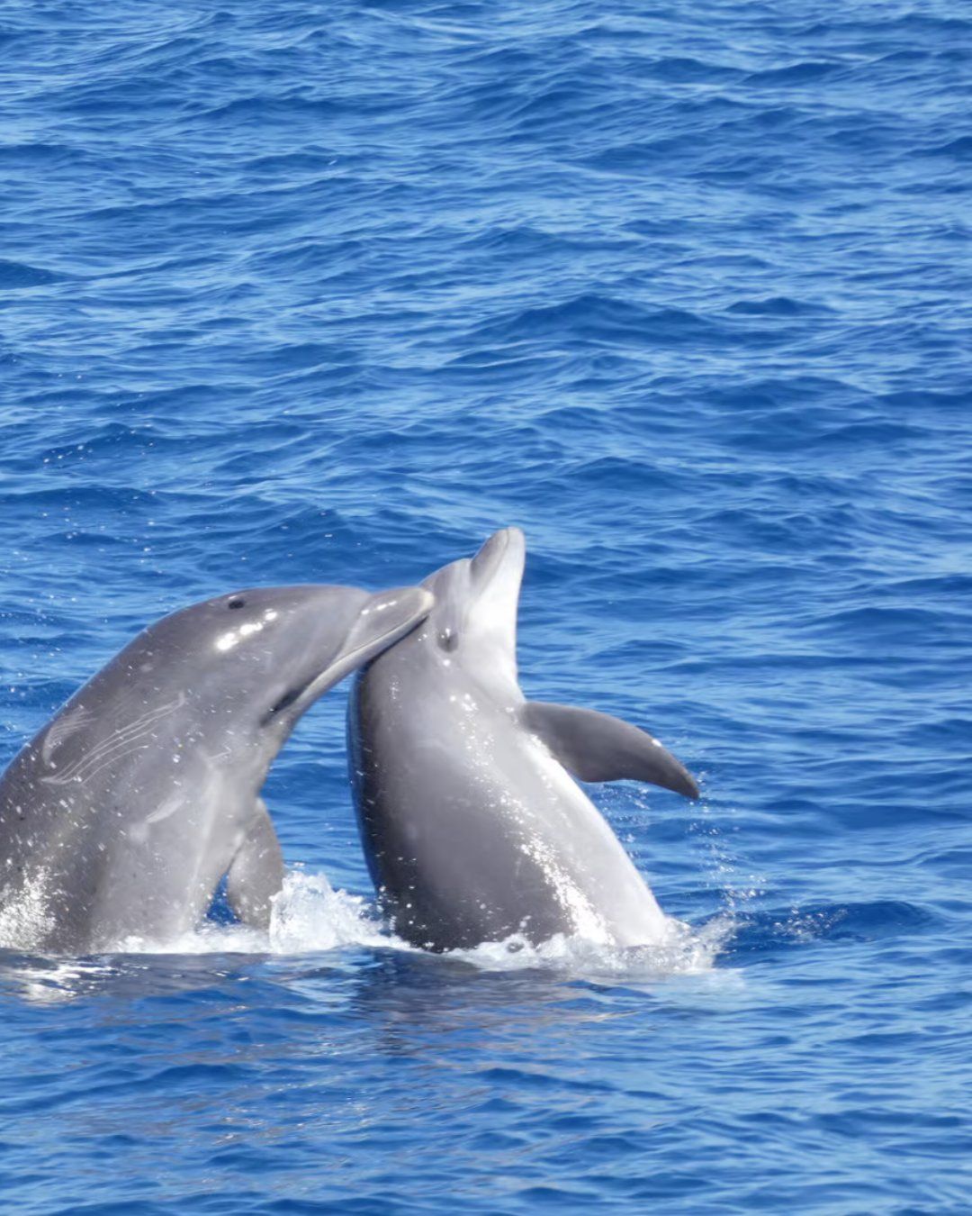 Po chvíli na moři se nám podařilo spatřit první skupinu delfínů, kteří skákali kolem přídě. Bylo to neskutečné – žádné nucené přibližování, prostě jsme jen čekali a oni sami připluli k lodi. Později jsme viděli i menší skupinu velryb, které se klidně pohybovaly podél naší trasy. Ten pocit, když se vám takový obr vynoří u lodi, je k nezaplacení.