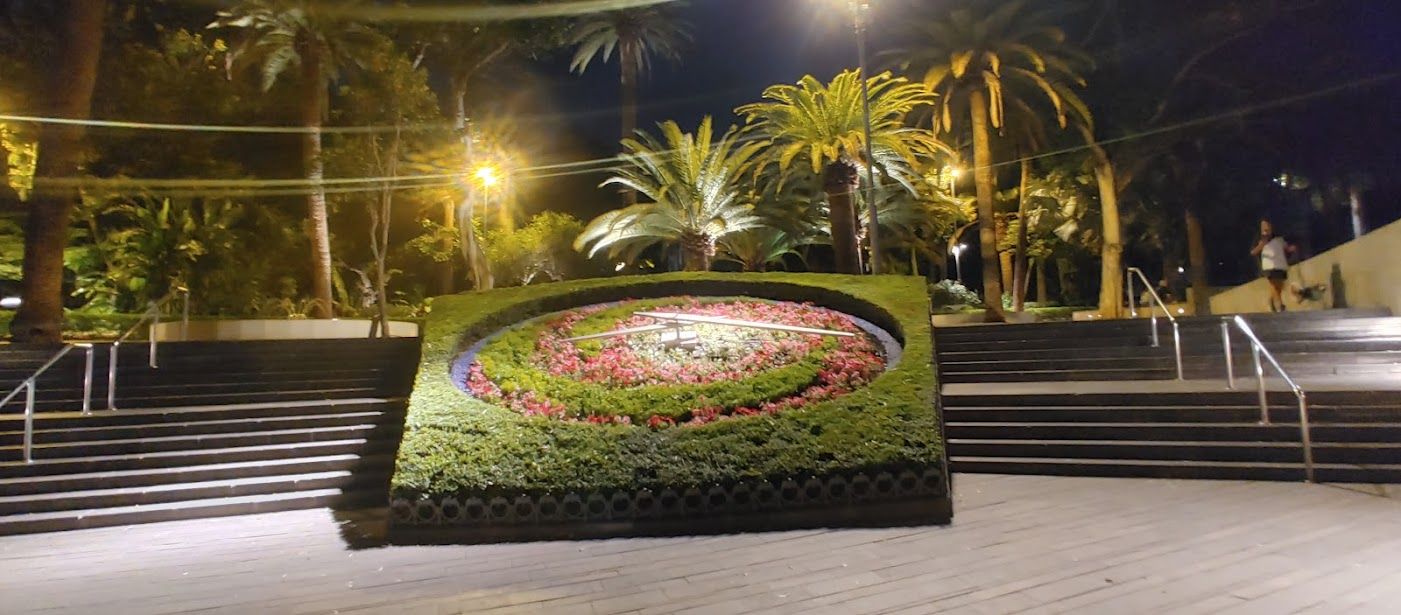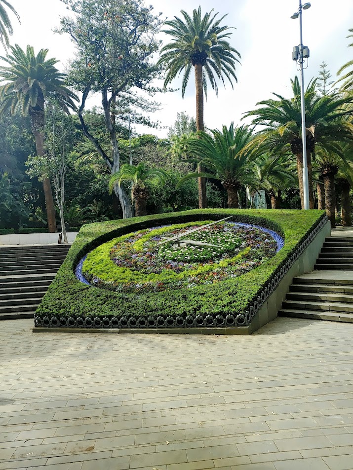 Barevné záhony, monumentální květinové hodiny, sochy moderního umění a vysoké palmy vytvářely klidný, až magický prostor, kde se dalo na chvíli vypnout. Ideální místo na ranní kávu nebo večerní procházku.