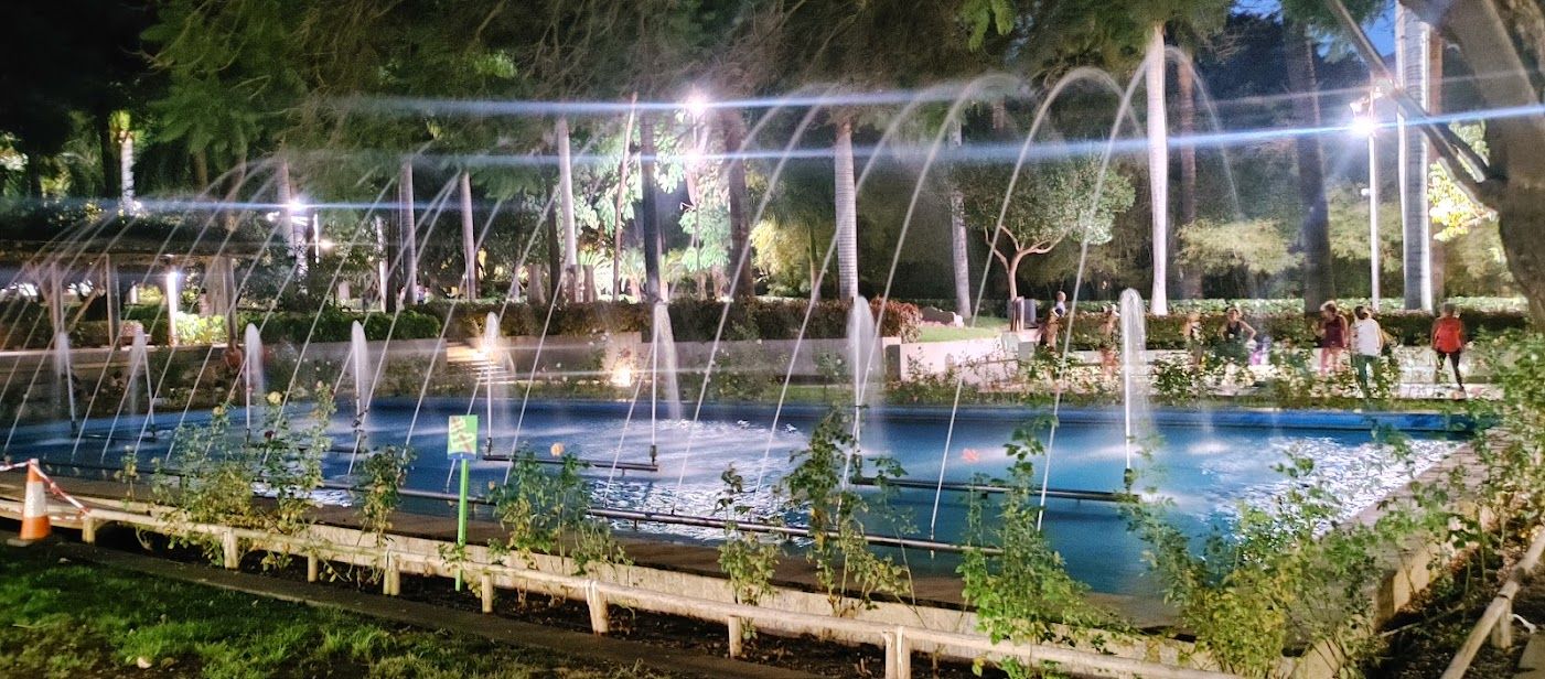Večer se park proměňuje – nasvícené fontány a tichá zákoutí dýchají romantikou. ✨